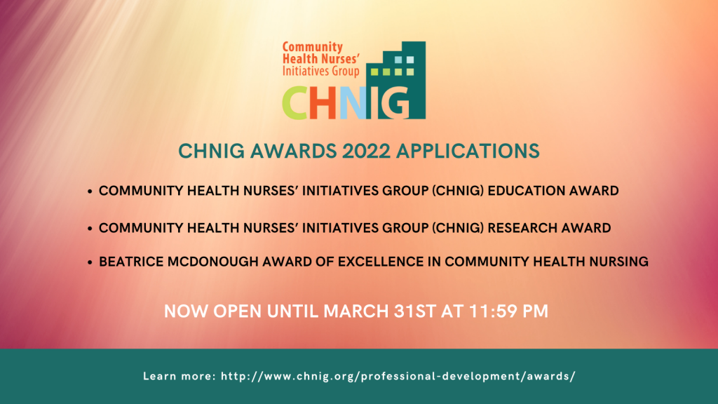 Every year, CHNIG recognizes the exemplary clinical practice of a community health nurse. The nominee is a community health nurse providing nursing services to individuals, families, communities, or populations, and must be a current member of CHNIG. The deadline for all supporting documents is March 31st at 11:59 p.m.