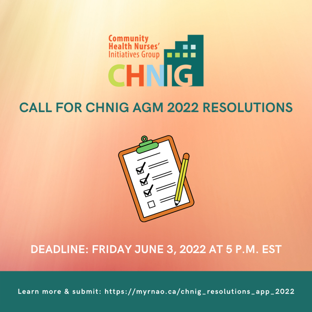 The Community Health Nurses’ Initiatives Group (CHNIG) is encouraging our members to submit resolutions for review and discussion at the CHNIG Annual General Meeting. The deadline for resolutions this year is June 3, 2022, 5PM EST. Members who submit resolutions to CHNIG’s 2022 AGM are raising the profile of important issues, and engaging colleagues in discussions that matter to community health nursing.