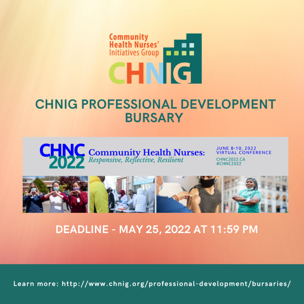 We are pleased to announce that CHNIG bursaries will be offered to support members interested in attending the National Community Health Nurses of Canada Conference (Virtual) from June 8 to 10, 2022.