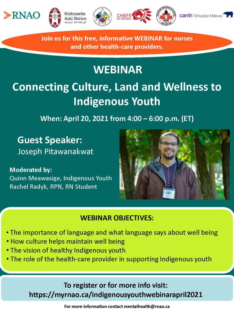 This webinar is in partnership with the Registered Nurses’ Association of Ontario (RNAO), Nishnawbe Aski Nation (NAN), Chiefs of Ontario (COO), the Centre for Addiction and Mental Health (CAMH) Shkaabe Makwa, the Canadian Indigenous Nurses Association (CINA) and Ontario First Nation Young Peoples Council (OFNYPC).
