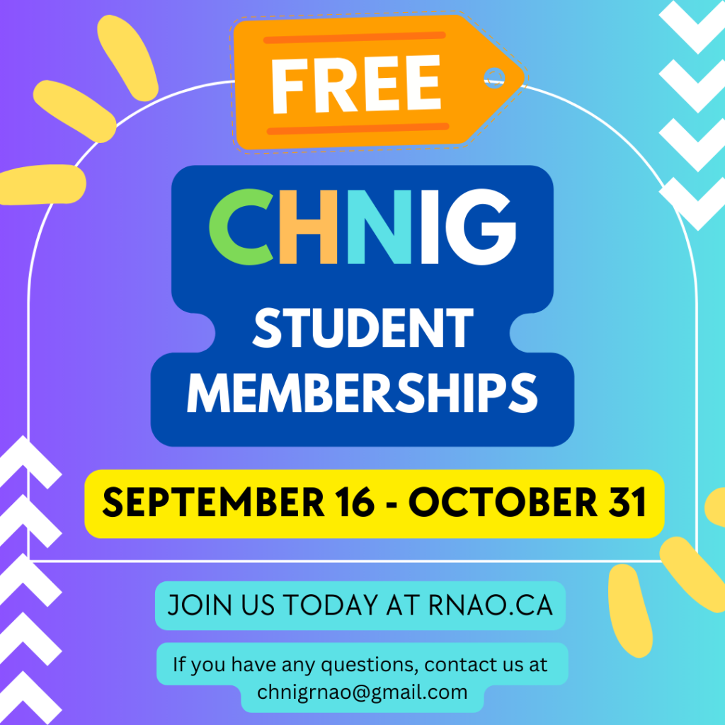 Attention students! CHNIG is now offering FREE student memberships from September 16 – October 31. If you have any questions, please email us at chnigrnao@gmail.com Join us today at rnao.ca !