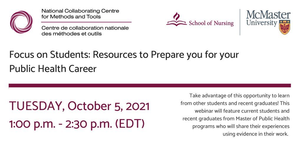 The National Collaborating Centre for Methods and Tools (NCCMT) looks forward to hosting its popular student-led webinar on evidence-informed decision making (EIDM) in public health programs, where students and recent graduates will showcase how they have used EIDM tools and resources. EIDM skills are in demand in the workforce: join this webinar to learn how the NCCMT’s accessible and informative resources can support your coursework, practicums and future public health careers.