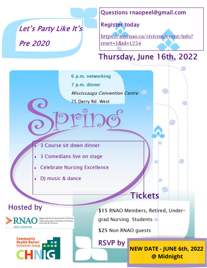 You are invited to RNAO Peel & CHNIG – Party Like It’s Pre 2020 on June 16th, 2022 at 6:00PM – 9:00PM. Come celebrate with us and Peel Chapter.  We have networking, dinner, comedy, dancing and other cool activities. Don’t delay – register by June 6th, 2022 at midnight, and join the best teams and celebrate! If you have any questions, please email rnaopeel@gmail.com.