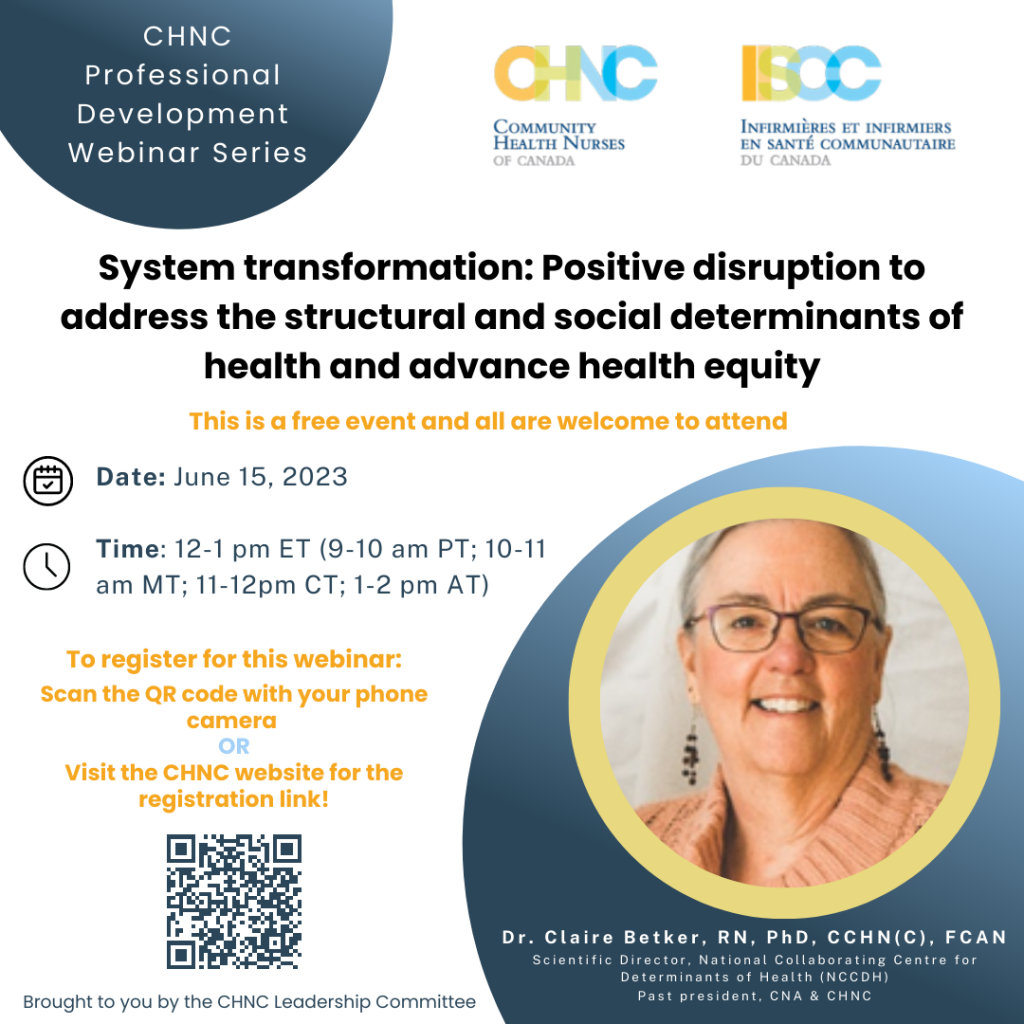 CHNC is pleased to announce the next webinar session on June 15, 2023 from 12:00 – 1:00 pm. Dr. Claire Betker will speak to us about System transformation: Positive disruption to address the structural and social determinants of health and advance health equity.